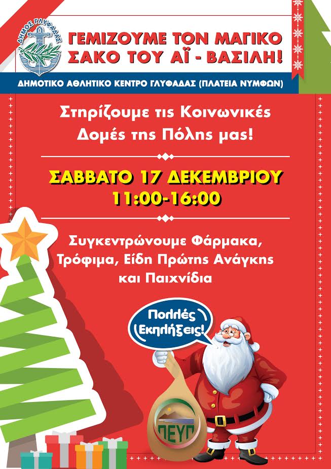 Το Σάββατο 17 Δεκεμβρίου, γεμίζουμε τον σάκο του Άη – Βασίλη ενισχύοντας τις κοινωνικές δομές του Δήμου Γλυφάδας.