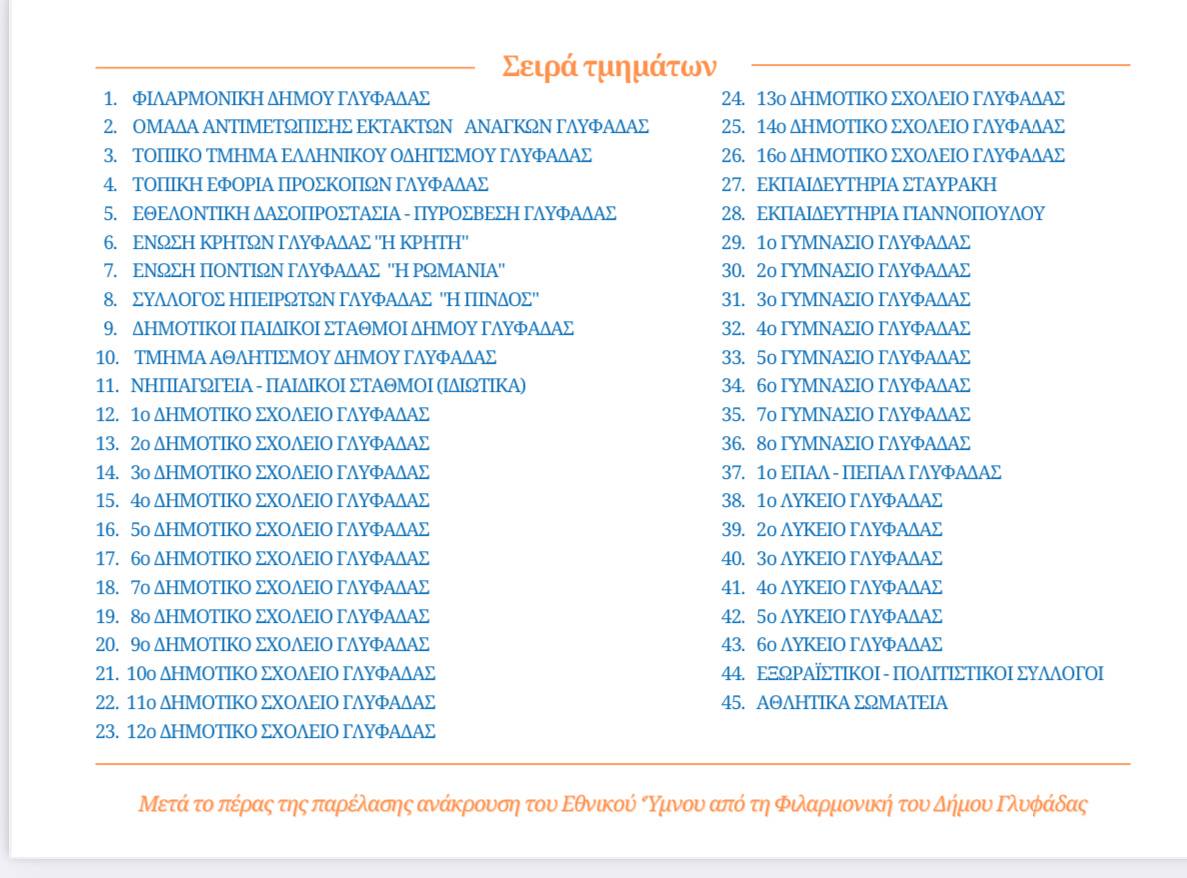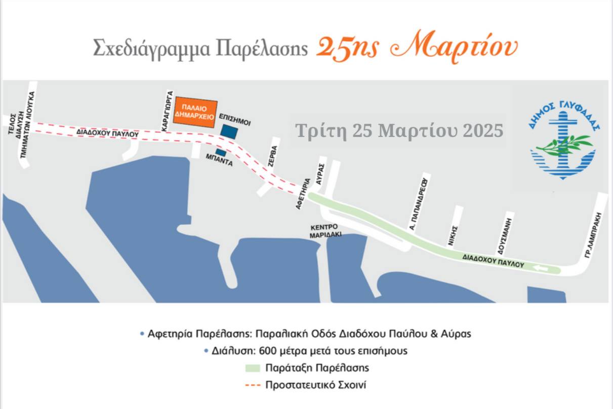 Η παρέλαση θα ξεκινήσει στις 11:30 από τη συμβολή της παραλιακής οδού Διαδόχου Παύλου και Αύρας, με τη συμμετοχή μαθητών, συλλόγων και φορέων. Για πρώτη φορά φέτος, στην παρέλαση θα συμμετάσχουν και τα παιδιά των Δημοτικών Παιδικών Σταθμών Γλυφάδας.