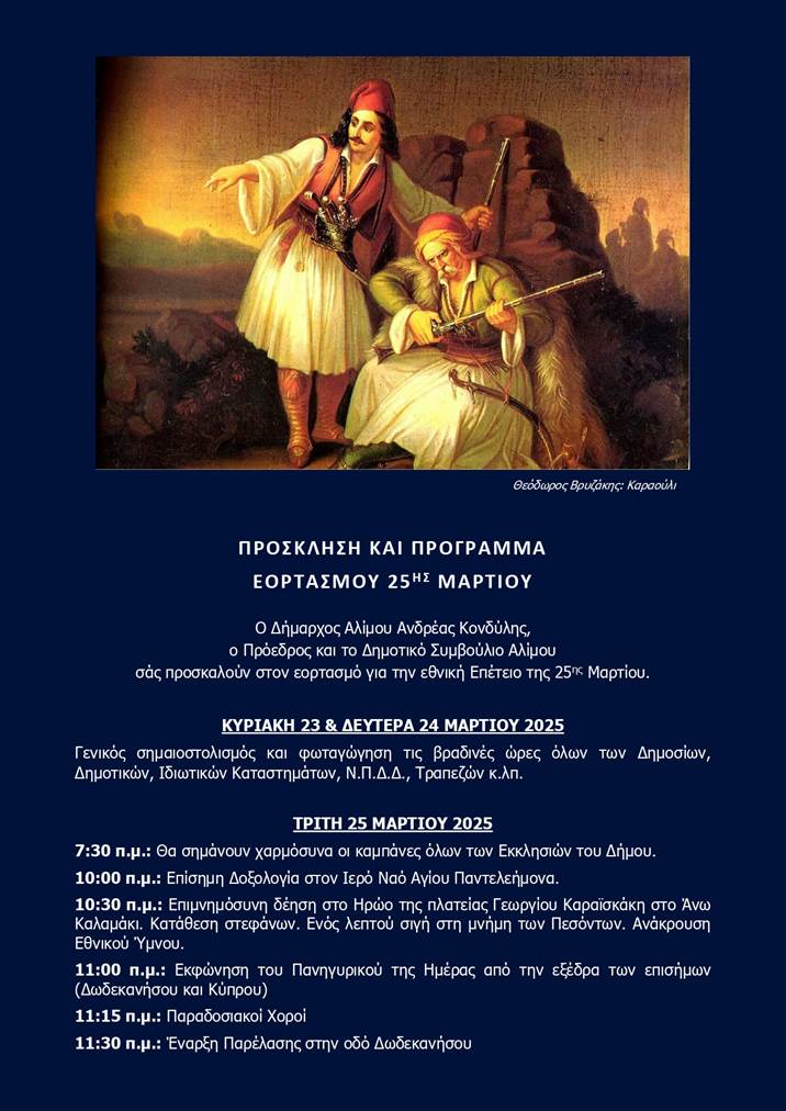 Την Τρίτη 25 Μαρτίου 2025, οι εκδηλώσεις θα κορυφωθούν με την καθιερωμένη μαθητική παρέλαση, που θα πραγματοποιηθεί στις 11:00 π.μ. επί της Λεωφόρου Αναγυρούντος στη Δημοτική Ενότητα Βάρης.