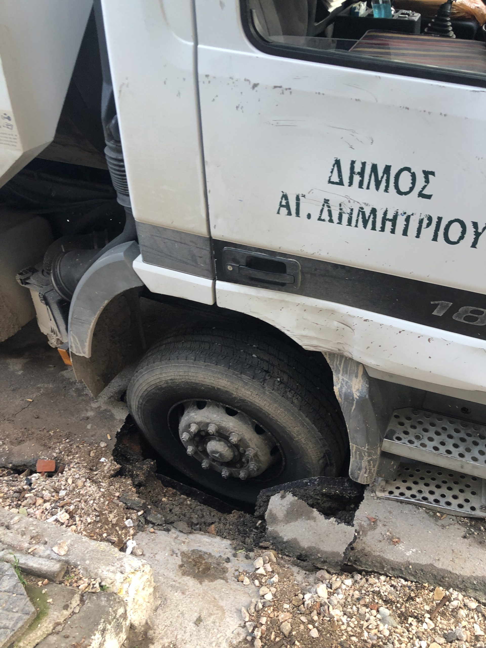 Άγιος Δημήτριος: Υποχώρησε το οδόστρωμα και εγκλωβίστηκε απορριμματοφόρο λόγω βλάβης της ΕΥΔΑΠ