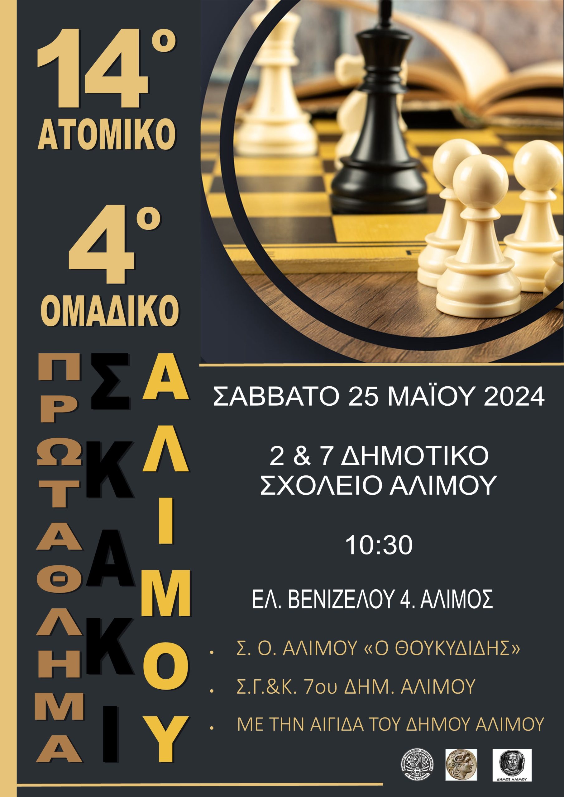Το 4ο Ομαδικό Πρωτάθλημα Αλίμου και το 14ο Ατομικό Πρωτάθλημα Αλίμου διεξάγονται το Σάββατο 25 Μαΐου και ώρα 10:30 στο 2ο και 7ο δημοτικό σχολείο (Ελ. Βενιζέλου 4, Άλιμος).