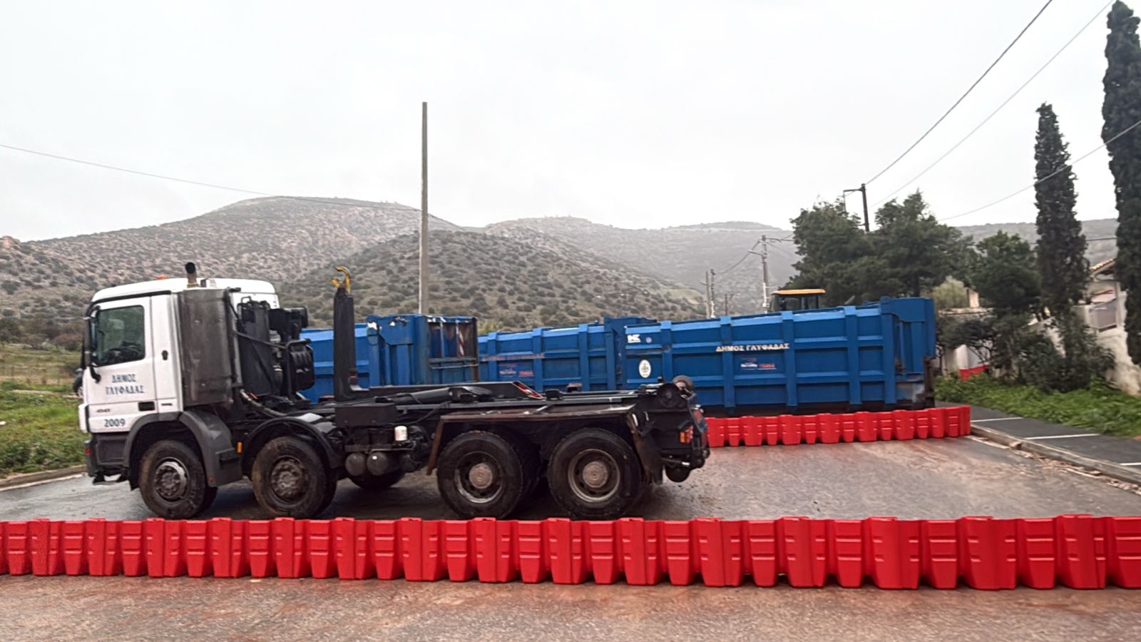 Προληπτικά μέτρα για την αποτροπή νέων πλημμυρικών φαινομένων λαμβάνει ο Δήμος Γλυφάδας στην Άνω Γλυφάδα, τοποθετώντας κοντέινερ και ειδικές πλαστικές διατάξεις στην αρχή της οδού Μετσόβου.