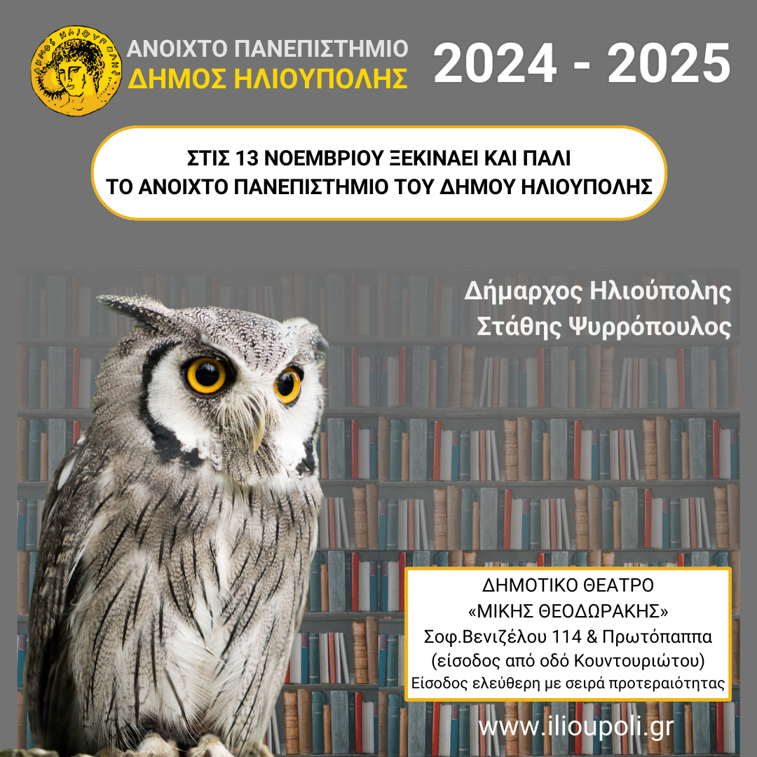 Στις 13 Νοεμβρίου ξεκινούν τα μαθήματα στο Ανοιχτό Πανεπιστήμιο Δήμου Ηλιούπολης με καλεσμένους καθηγητές και ανθρώπους του πολιτισμού που θα καλύψουν πληθώρα θεματικών μέχρι τον Απρίλιο του 2025.