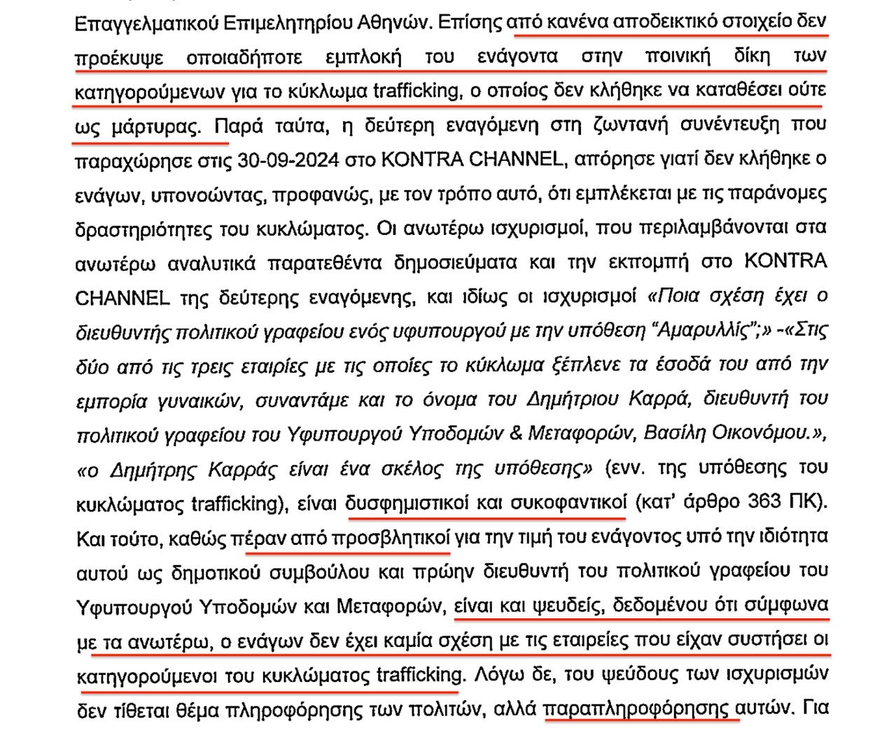 Έναν χρόνο μετά τη δημοσιοποίηση δημοσιευμάτων που συνέδεαν τον Δημήτρη Καρρά με διερευνώμενη ποινική υπόθεση, το Μονομελές Πρωτοδικείο Αθηνών εξέδωσε απόφαση στην οποία καταλήγει ότι “από κανένα αποδεικτικό στοιχείο δεν προέκυψε οποιαδήποτε εμπλοκή του ενάγοντα (σ.σ. Δημήτρη Καρρά) στην ποινική δίκη των κατηγορούμενων για το κύκλωμα trafficking, ο οποίος δεν κλήθηκε να καταθέσει ούτε ως μάρτυρας”. Από την πλευρά του ο Δημήτρης Καρράς, δημοτικός σύμβουλος Βάρης-Βούλας-Βουλιαγμένης, κάνει λόγο για πλήρη δικαίωσή του και με ανάρτησή του υπογραμμίζει πως θα συνεχίσει «μέχρι τέλους».