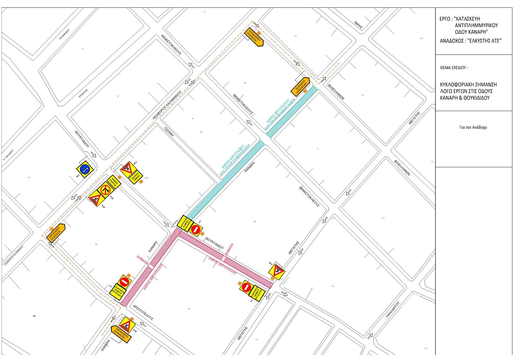 - Τις αμέσως επόμενες ημέρες θα ξεκινήσουν εργασίες και σε τμήμα της οδού Κανάρη (από Αριστοτέλους έως Θουκυδίδου), καθώς και σε τμήμα της οδού Θουκυδίδου (από Κανάρη έως Μεγίστης). Οι εργασίες αυτές θα διαρκέσουν 2 περίπου μήνες, στη διάρκεια των οποίων οι δρόμοι θα είναι κλειστοί και η κυκλοφορία θα διεξάγεται σύμφωνα με το σχεδιάγραμμα της φωτογραφίας. Με γαλάζιο χρώμα φαίνεται η περιοχή που είναι ήδη κλειστή και οι εργασίες προχωρούν, ενώ με κόκκινο χρώμα η περιοχή που σύντομα θα κλείσει για εργασίες.