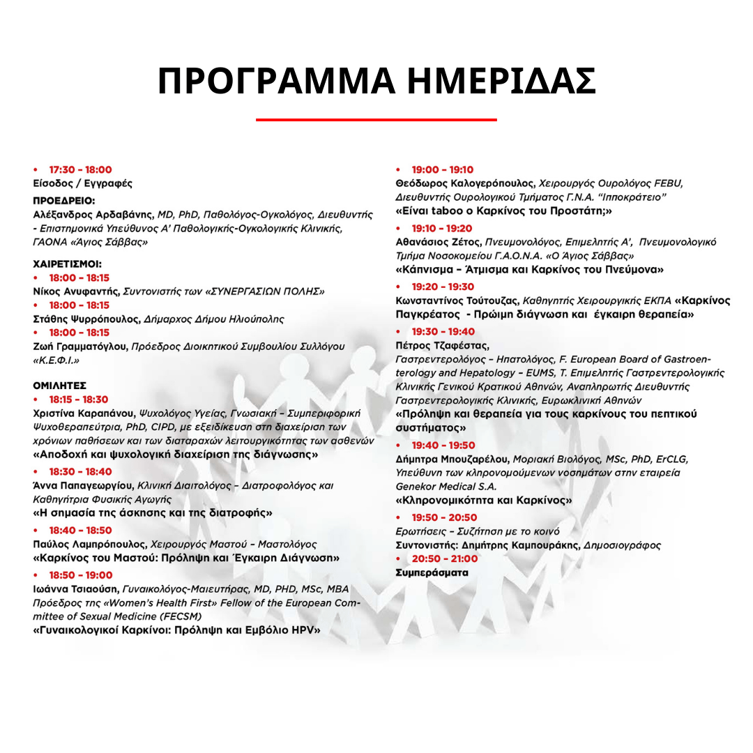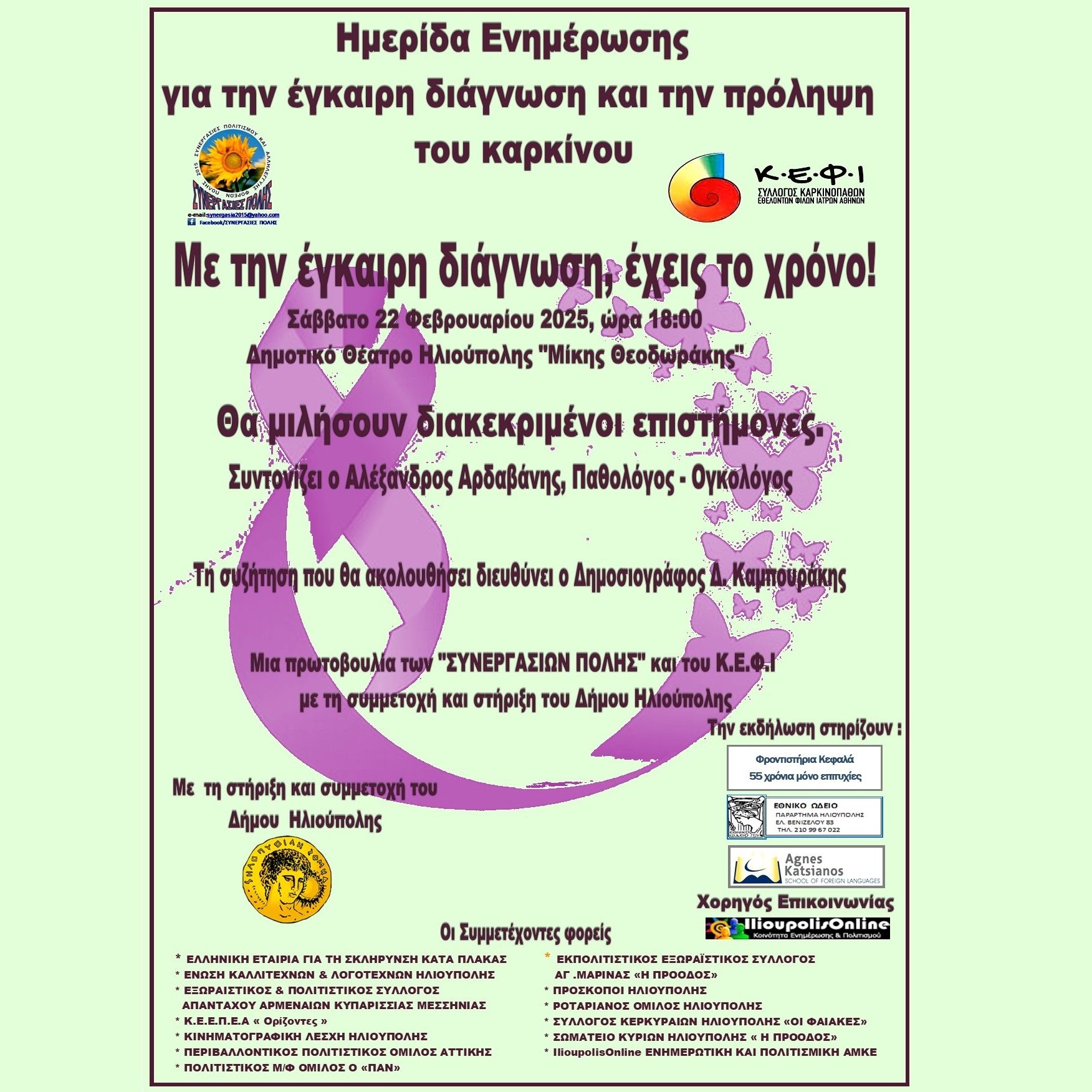 Ο καρκίνος είναι μια σύγχρονη πρόκληση για τη δημόσια υγεία, αλλά η έγκαιρη διάγνωση και η σωστή ενημέρωση μπορούν να κάνουν τη διαφορά. Με στόχο την ευαισθητοποίηση του κοινού, οι «ΣΥΝΕΡΓΑΣΙΕΣ ΠΟΛΗΣ» και το Κ.Ε.Φ.Ι., με τη στήριξη του Δήμου Ηλιούπολης, διοργανώνουν μια σημαντική ημερίδα ενημέρωσης.