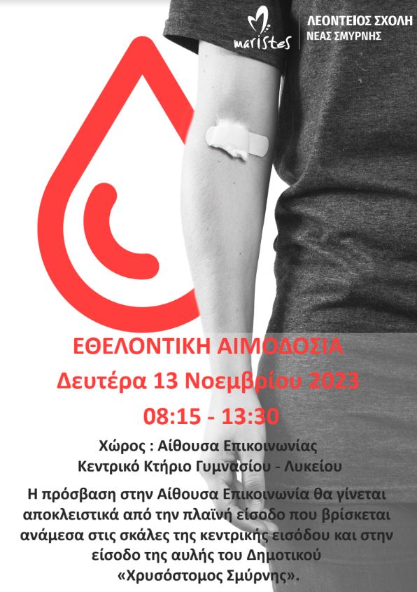 Τη Δευτέρα 13 Νοεμβρίου η Λεόντειος Σχολή Νέας Σμύρνης οργανώνει εθελοντική αιμοδοσία στον χώρο του σχολείου από τις 08.15 έως τις 13.30.