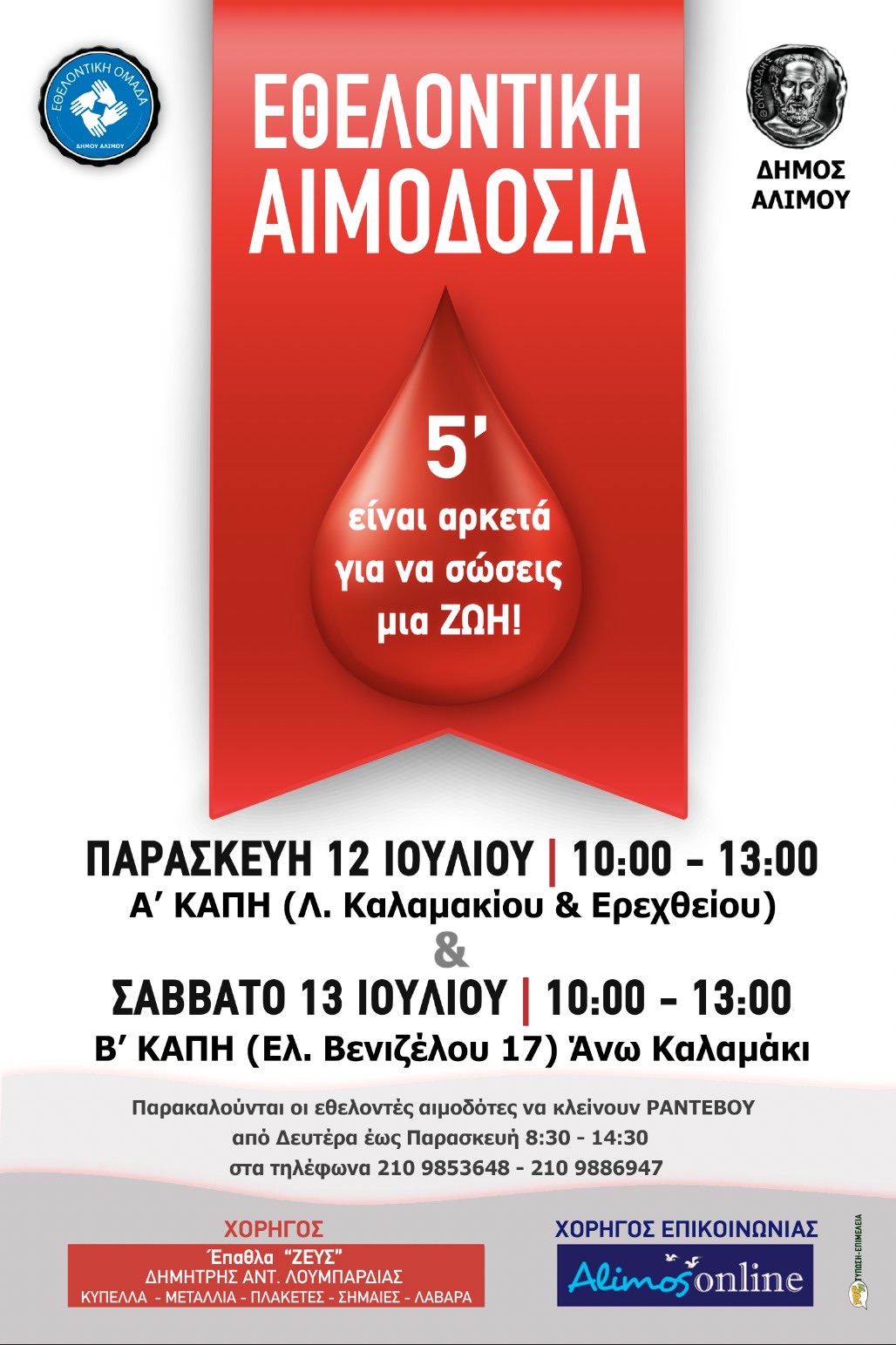 Ενόψει των αυξημένων αναγκών σε αίμα που υπάρχουν το καλοκαιρί ο Δήμος Αλίμου οργανωνει εθελοντική αιμοδοσία την Παρασκευή 12 και το Σάββατο 13 Ιουλίου