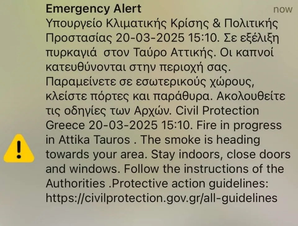 Λόγω της έντονης καπνιστικής επιβάρυνσης, η Πολιτική Προστασία ενεργοποίησε το 112, στέλνοντας προειδοποιητικό μήνυμα στους κατοίκους της περιοχής. Το μήνυμα συμβουλεύει τους πολίτες να παραμείνουν σε εσωτερικούς χώρους και να κλείσουν πόρτες και παράθυρα, προκειμένου να προστατευθούν από την εισπνοή καπνού.