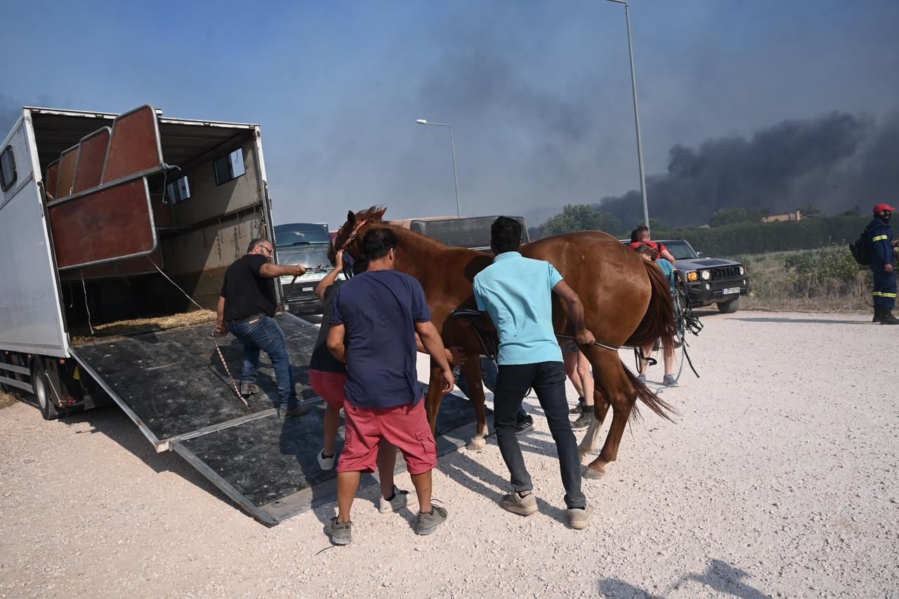 Οι υπεύθυνοι μεταφέρουν τα άλογα με φορτηγά, την ώρα που οι στάβλοι τυλίγονται στις φλόγες.