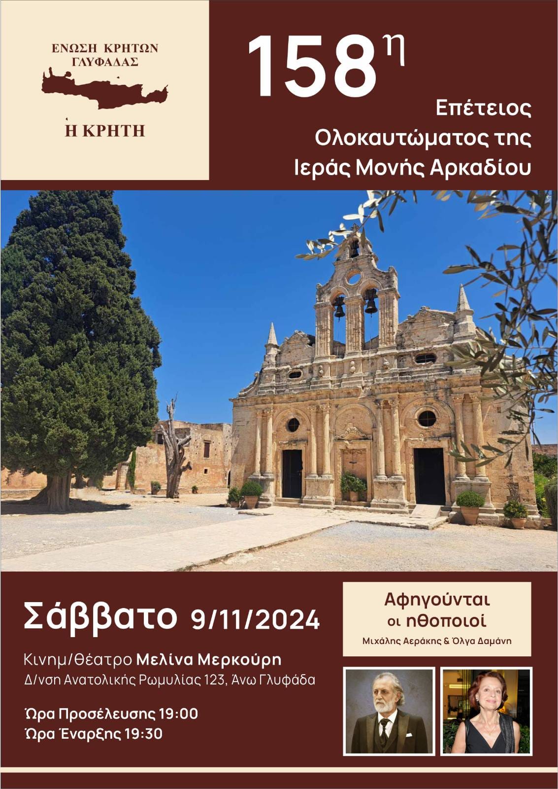 Το Σάββατο 9 Νοεμβρίου, οι Κρήτες της Γλυφάδας θα τιμήσουν την ιστορική μνήμη του Ολοκαυτώματος της Ιεράς Μονής Αρκαδίου, ενός γεγονότος που έπαιξε καθοριστικό ρόλο στον απελευθερωτικό αγώνα της Κρήτης. Η εκδήλωση, οργανωμένη από την Ένωση Κρητών Γλυφάδας, αποτελεί φόρο τιμής στους προγόνους που έδωσαν τη ζωή τους για την ελευθερία, με αφηγήσεις, μουσική και χορούς που ζωντανεύουν τη μνήμη τους.