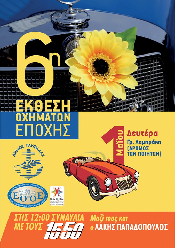Την Πρωτομαγιά, ο Δήμος Γλυφάδας και η Ελληνική Ομοσπονδία Οχημάτων Εποχής (Ε.Ο.Ο.Ε.) συνδιοργανώνουν μια ανοιξιάτικη έκθεση με αυτοκίνητα αντίκες και άλλα ιστορικά οχήματα, η οποία πλαισιώνεται από συναυλία του γνωστού συγκροτήματος 1550. Μαζί τους, ο παλιός, γνωστός ροκάς Λάκης Παπαδόπουλος, που θα απογειώσει το κέφι.