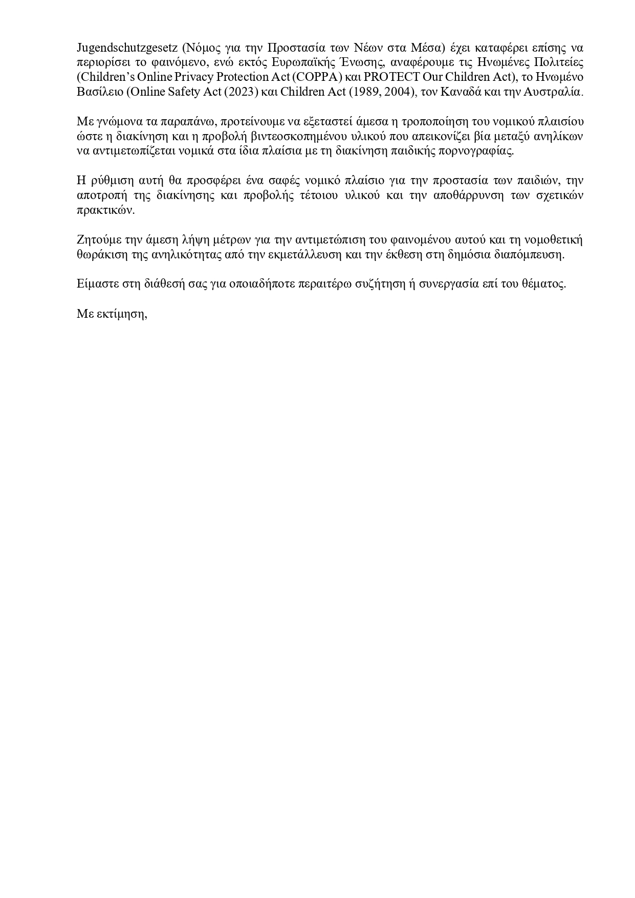 Παράλληλα, γίνεται αναφορά σε παραδείγματα άλλων χωρών, όπως η Γαλλία, η Γερμανία, το Ηνωμένο Βασίλειο, οι ΗΠΑ, ο Καναδάς και η Αυστραλία, όπου έχουν ήδη θεσπιστεί αυστηροί κανόνες για την προστασία των ανηλίκων από την ηλεκτρονική εκμετάλλευση και την έκθεση σε βίαιο περιεχόμενο.