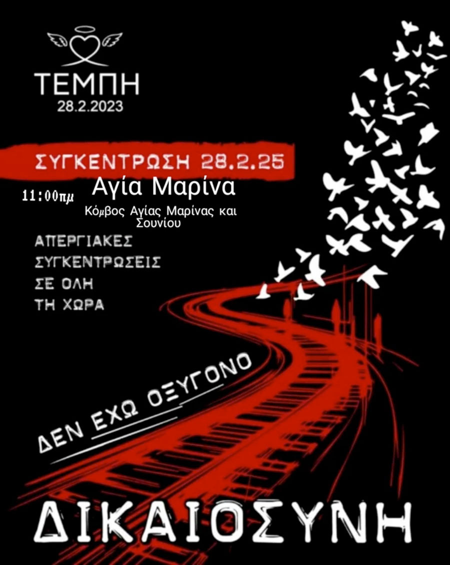 Την Τετάρτη στις 11:00 το πρωί, στη διασταύρωση της Λεωφόρου Αγίας Μαρίνας και Αθηνών-Σουνίου, θα πραγματοποιηθεί συγκέντρωση μνήμης και διαμαρτυρίας για την τραγωδία των Τεμπών.