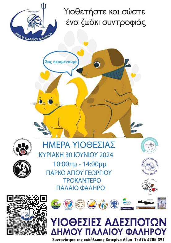 Ο Δήμος Παλαιού Φαλήρου διοργανώνει Ημέρα Υιοθεσίας Αδέσποτων την Κυριακή 30 Ιουνίου από τις 10.00 έως τις 14.00 στο Πάρκο Αγίου Γεωργίου στο Τροκαντερό, με σύνθημα: «Αγαπώ και Φροντίζω Υιοθετώντας ένα από τα Αδεσποτάκια του Δήμου Παλαιού Φαλήρου».