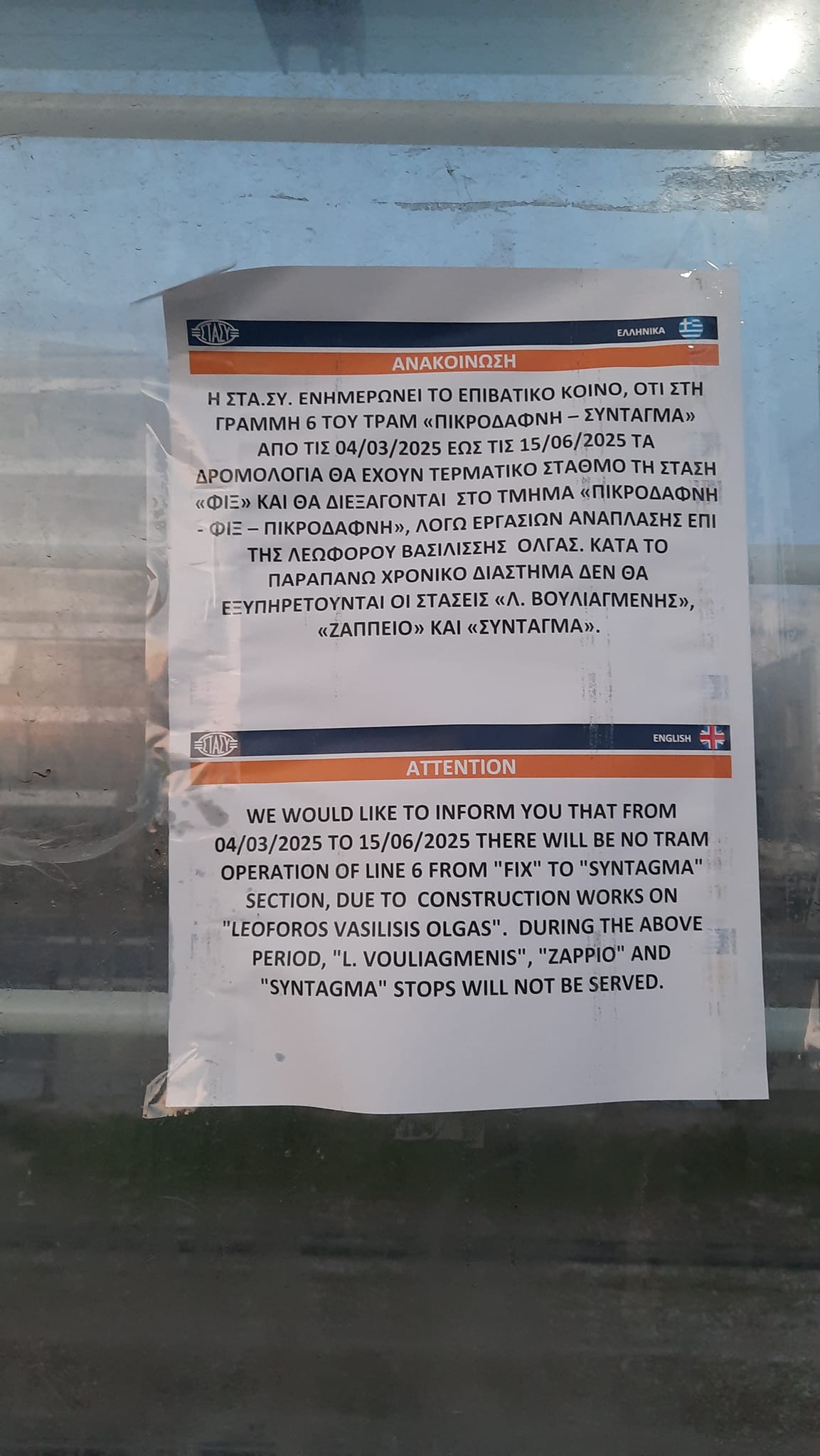 Σύμφωνα με ανακοίνωση του ΟΑΣΑ, η προσωρινή διακοπή θα διαρκέσει έως τις 15 Ιουνίου 2025, αφήνοντας εκτός λειτουργίας τις στάσεις Σύνταγμα, Ζάππειο και Λεωφόρος Βουλιαγμένης. Η απόφαση εντάσσεται στο πλαίσιο των έργων ανάπλασης της Βασ. Όλγας, τα οποία βρίσκονται σε εξέλιξη. Η διακοπή της κυκλοφορίας είχε προαναγγελθεί από τον επικεφαλής της Ανάπλασης Δημόσιων Χώρων Α.Ε., Χ. Ακριτίδη, ενώ, σύμφωνα με το αρχικό χρονοδιάγραμμα της προηγούμενης δημοτικής αρχής, θα έπρεπε να είχε ξεκινήσει ήδη από το 2021.