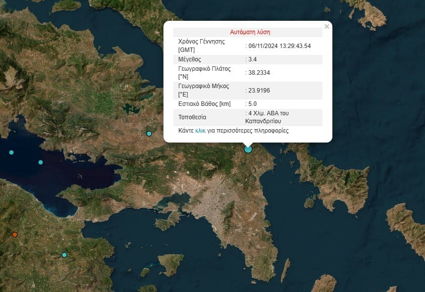 Το μεσημέρι της Τετάρτης 6/11 σεισμική δόνηση της τάξης των 3,4 ρίχτερ με επίκεντρο το Καπανδρίτι ταρακούνησε και τα νότια.