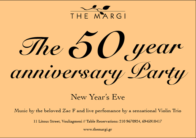 Την τελευταία μέρα αυτού του χρόνου το Margi θα σβήσει τα 50 κεράκια του και σε προσκαλεί να γιορτάσεις μαζί του σ'ένα επετειακό πάρτι με τίτλο “The 50 year Anniversary Party @ The Margi Hotel”!