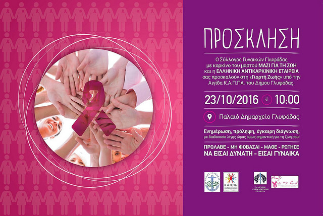 Ο Σύλλογος Γυναικών Γλυφάδας με καρκίνο μαστού Μαζί για τη Ζωή, σε προσκαλεί σε μια μεγάλη «Γιορτή Ζωής» που θα πραγματοποιηθεί την Κυριακή 23/10/2016, στο Παλαιό Δημαρχείο Γλυφάδας (Σάκη Καράγιωργα 2 & Διαδόχου Παύλου), παρουσιάζοντας πολυποίκιλες δράσεις (10:00-14:00), υπό την Αιγίδα ΚΑΠΠΑ του Δήμου Γλυφάδας.