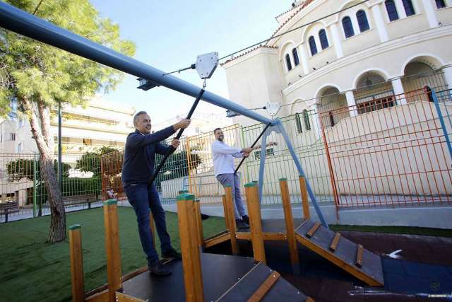 Γλυφάδα: ο δήμαρχος, Γιώργος Παπανικολάου, δοκιμάζει τη νέα παιδική χαρά
