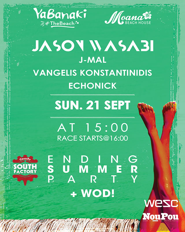Το ρόλο του να ξεσηκώσει τον κόσμο με τη μουσική του θα έχει ο Jason Wasabi, μαζί με το South Factory. Θα ενώσουν τις δυνάμεις τους στα decks του Yabanaki για να δώσουν τον καλύτερο τόνο στο απόλυτο φινάλε της σεζόν. Το DJ set θα ξεκινήσει από τις 16.00 και θα συνεχιστεί όλη τη νύχτα, γιατί αν μη τι άλλο στα νότια ξέρουμε να… παρτάρουμε.