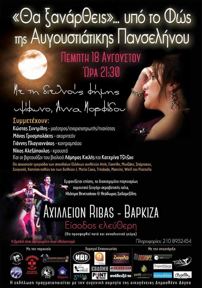 Την Πέμπτη 18 Αυγούστου στις 21:30, στον χώρο του Αχίλλειον Ribas. Η είσοδος είναι ελεύθερη.