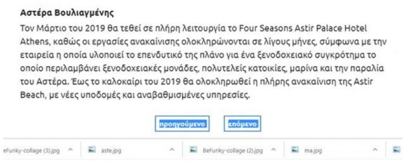 Το ακίνητο στο οποίο κατά το παρελθόν λειτουργούσε το φημισμένο ξενοδοχείο «Αστέρια» προβλέπεται να ανακατασκευαστεί πλήρως σε υπερπολυτελές αστικό θέρετρο. Το ξενοδοχείο θα πλαισιωθεί από εμπορικές δραστηριότητες αλλά και υπηρεσίες εστίασης.