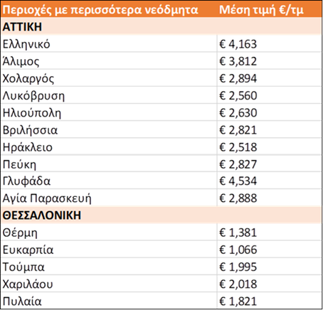 Στη λίστα με τις τιμές των νεόδμητων ακινήτων ακολουθεί ο γειτονικός Άλιμος με μέση τιμή €3,812 ανά τ.μ.,τρίτος έρχεται ο Χολαργός, όπου η μέση τιμή προσφοράς είναι στα €2,894, τέταρτη σε πλειονότητα νεόδμητων είναι η Λυκόβρυση με €2,560 και έπεται η Ηλιούπολη με μέση τιμή €2,630 ανά τ.μ. Τη δεκάδα συμπληρώνουν τα Βριλήσσια με μέση τιμή €2,821/τ.μ., το Ηράκλειο στα €2,518/τ.μ., η Πεύκη στα €2,827/τ.μ., η Γλυφάδα με την υψηλότερη μέση τιμή στα €4,534 και η Αγία Παρασκευή στα €2,888 ανά τ.μ.
