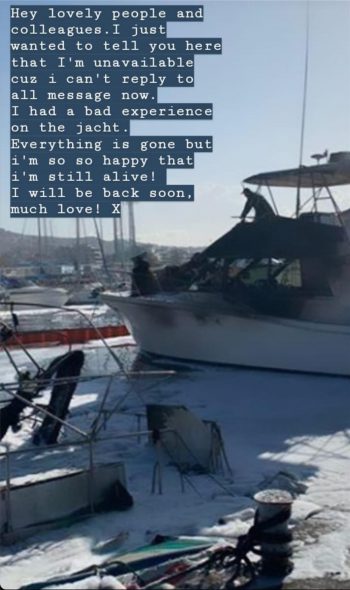 Μήνυμα προς τους φίλους της έστειλε μέσω instagram η 22χρονη Βελγίδα για να τους ενημερώσει ότι είναι καλά μετά την περιπέτειά της στη μαρίνα Γλυφάδας. Όπως λέει, είναι καλά μετά την άσχημη εμπειρία που είχε στο γιωτ. «Όλα πέρασαν, είμαι ακόμη ζωντανή», αναφέρει στο μήνυμά της και ζητά συγγνώμη που δεν μπορεί να απαντήσει σε όλα τα μηνύματα που δέχεται.