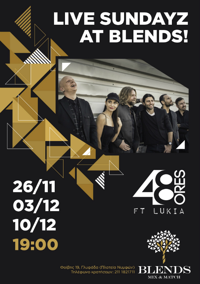 Ξεκινώντας από την Κυριακή 26 Νοεμβρίου και για 2 ακόμα Κυριακές (3/12 & 10/12), τα κυριακάτικα απογεύματα ζωντανεύουν με τα Live Sundayz at Blends, δίνοντας ραντεβού στις 19:00 με την αγαπημένη μπάντα 48 ώρες. Το μοναδικό group έρχεται στο Blends για να απογειώσει την διάθεση σας, προσφέροντας ένα δυνατό “super-blended” live πρόγραμμα, γεμάτο εκπλήξεις και αστείρευτη ενέργεια.