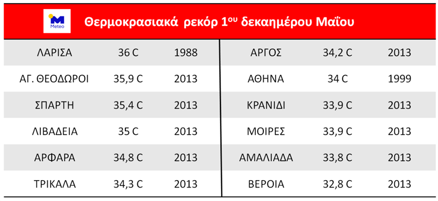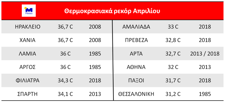 Με βάση την υπάρχουσα εικόνα είναι πολύ πιθανό να σημειωθούν νέα θερμοκρασιακά ρεκόρ. Στους πίνακες που ακολουθούν, παρουσιάζονται επιλεγμένα θερμοκρασιακά ρεκόρ του παρελθόντος για το μήνα Απρίλιο (πίνακας 1) και για το πρώτο δεκαήμερο του Μαΐου (πίνακας 2), όπως έχουν καταγραφεί είτε από το δίκτυο μετεωρολογικών σταθμών του Εθνικού Αστεροσκοπείου Αθηνών, είτε από την Εθνική Μετεωρολογική Υπηρεσία.