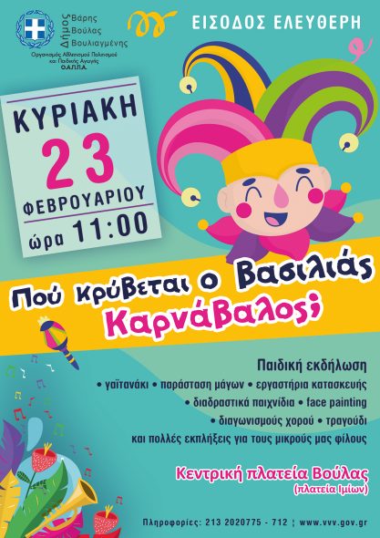 Με δύο ξεχωριστές εκδηλώσεις θα υποδεχτεί ο Δήμος Βάρης Βούλας Βουλιαγμένης τις Απόκριες. Το πρόγραμμα που έχει διοργανώσει ο Οργανισμός Αθλητισμού Πολιτισμού και Παιδικής Αγωγής του Δήμου, (ΟΑΠΠΑ) περιλαμβάνει εκδηλώσεις για μικρούς και μεγάλους με ελεύθερη είσοδο. Συγκεκριμένα:
