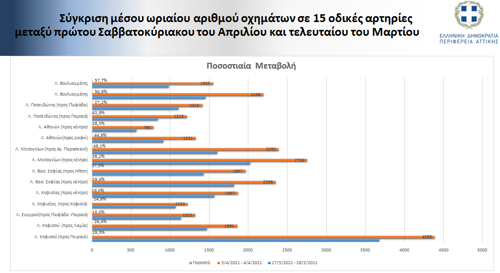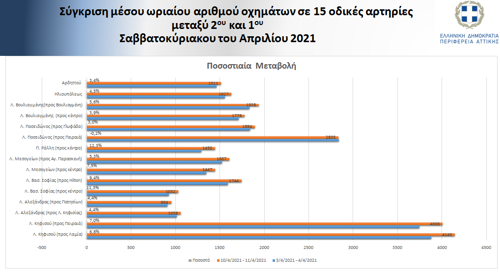 Η απόκλιση τα Σαββατοκύριακα σε σχέση με τις καθημερινές είναι σημαντική. Με βάση προηγούμενη καταγραφή των στατιστικών από την επιστημονική ομάδα του Κέντρου Κυκλοφορίας η οποία περιείχε στοιχεία μέχρι και την Τρίτη 13/4/2021, η κίνηση τις καθημερινές εμφάνιζε αύξηση μόλις 2,7%.