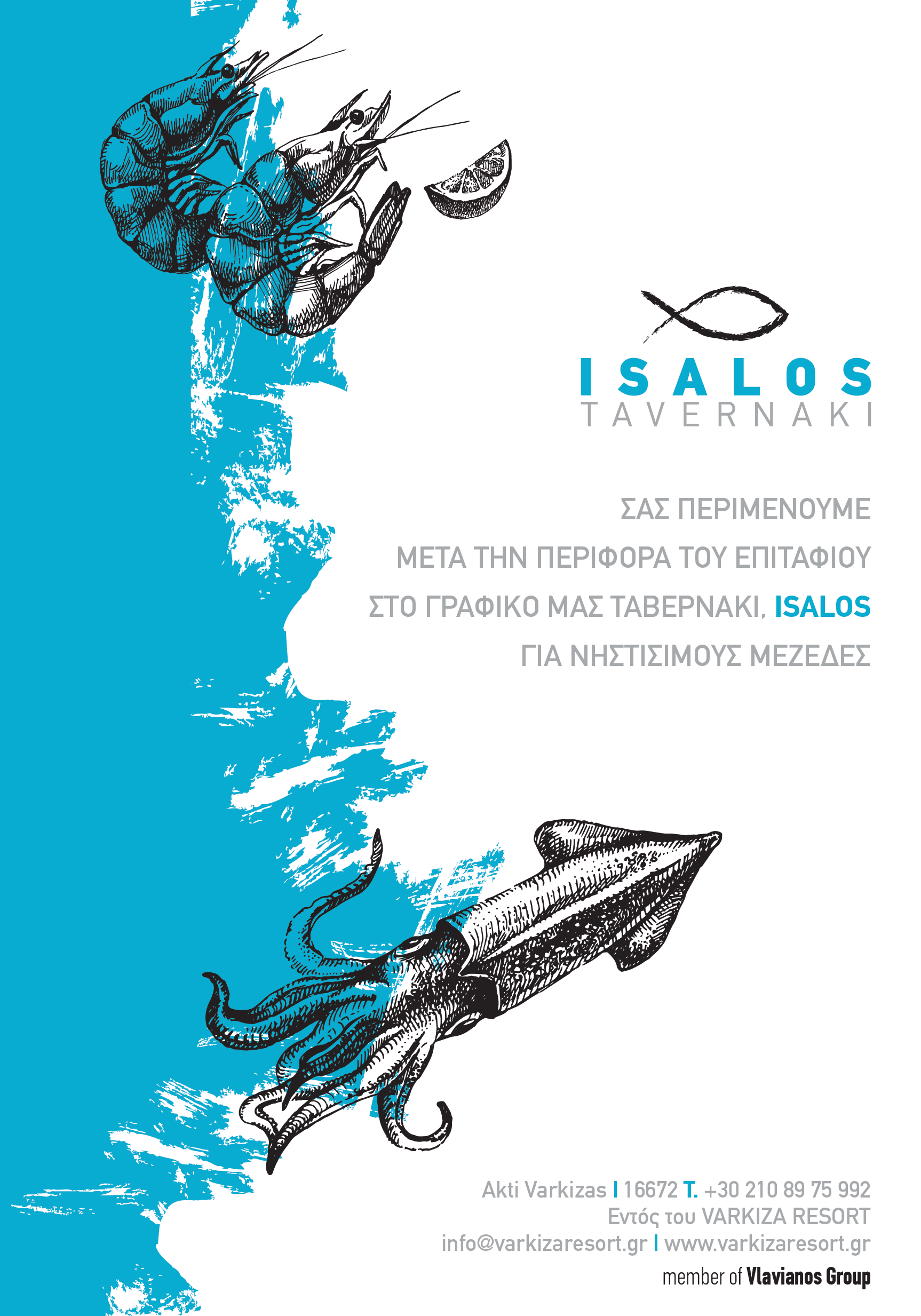 Το ISALOS άνοιξε τις πόρτες του στο Varkiza Resort και σε περιμένει το βράδυ της Μεγάλης Παρασκευής με πολλές νηστίσιμες γεύσεις και μεζεδάκια θαλασσινών.