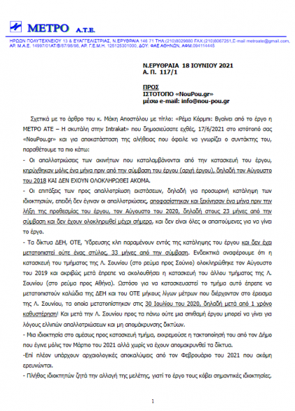 Αναλυτικά η επιστολή της ΜΕΤΡΟ ΑΤΕ προς το NouPou: ΑΠΟΚΑΤΑΣΤΑΣΗ ΤΗΣ ΑΛΗΘΕΙΑΣ ΣΕ ΑΡΘΡΟ ΓΙΑ ΤΗΝ ΚΑΤΑΣΚΕΥΗ ΤΟΥ ΕΡΓΟΥ ΡΕΜΑΤΟΣ ΚΟΡΜΠΙ ΑΠΟ ΜΕΤΡΟ ΑΤΕ(1)