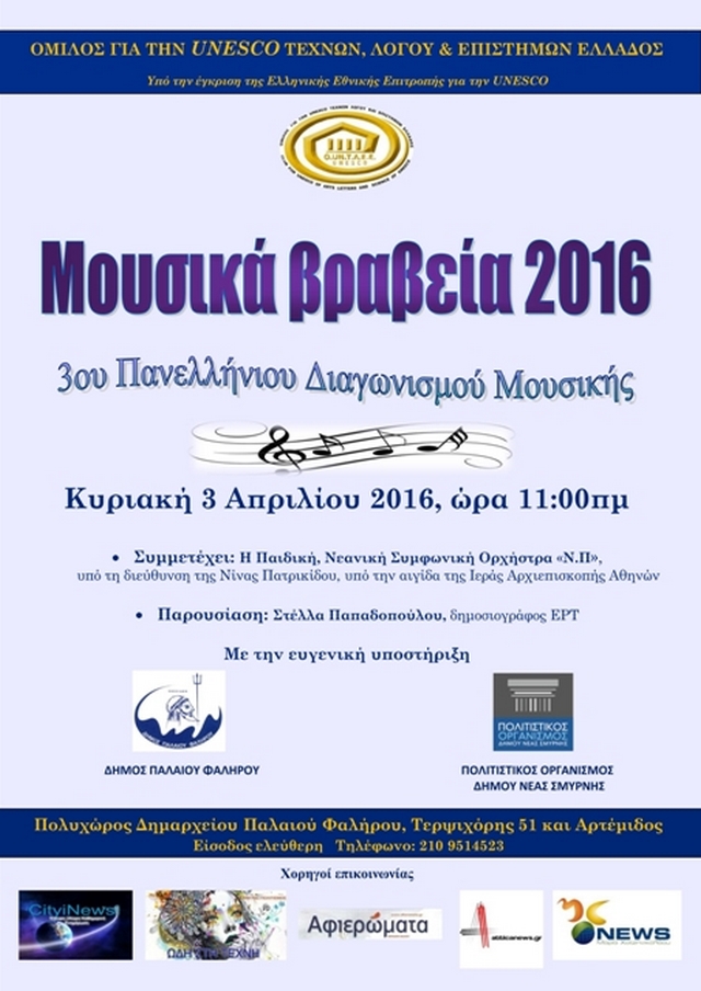 Ο Δήμος Παλαιού Φαλήρου μοιράζει τα βραβεία του αυτή την Κυριακή στους ταλαντούχους μουσικούς τους. Το ραντεβού έχει δοθεί την ερχόμενη Κυριακή (3/4) στις 11.00 στον Πολυχώρο του Δημαρχείου Παλαιού Φαλήρου.