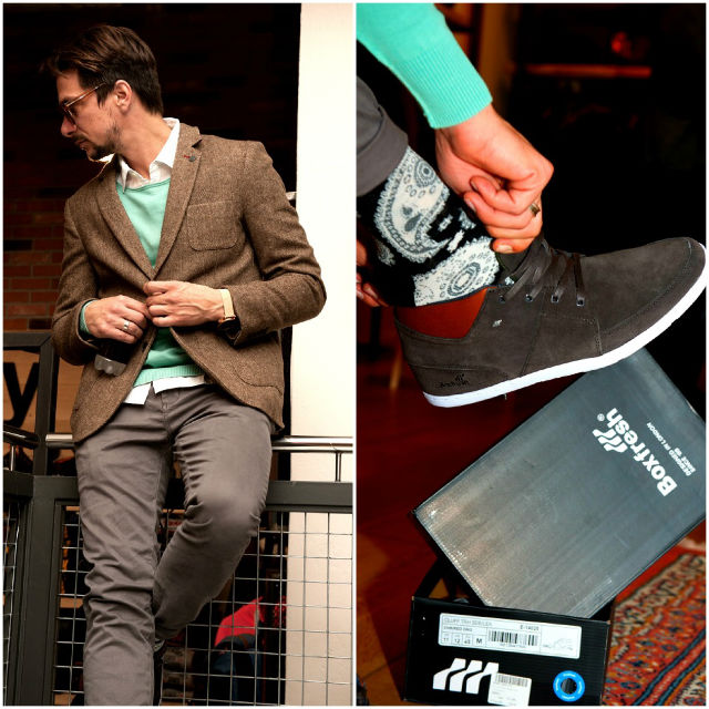 Στην συνέχεια ο Αντρέας, τόλμησε ένα τσακ παραπάνω από τους υπόλοιπους, αλλάζοντας εποχή με ύφος tweed style. Η vintage εκδοχή του μαγαζιού ήρθε η ώρα να φανεί και φορεμένη. Συνδυάζοντας ένα total look Dstrezzed, μαζί με γυαλιά και ρολόι Komono και παπούτσια Boxfresh.