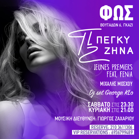 Εξαιρετική στην πίστα με ένα πολύ προσωπικό live performance με τις μεγαλύτερες επιτυχίες της, τραγούδια επιλεγμένα γιατί αγαπήθηκαν τόσο από την ίδια αλλά και τους πολυάριθμους θαυμαστές της, η Πέγκυ Ζήνα ανεβαίνει στην σκηνή του νυχτερινού μαγαζιού ΦΩΣσ΄ένα one woman showμε σπουδαία τραγούδια, πολλή ενέργεια και ένα δυνατό πρόγραμμα.