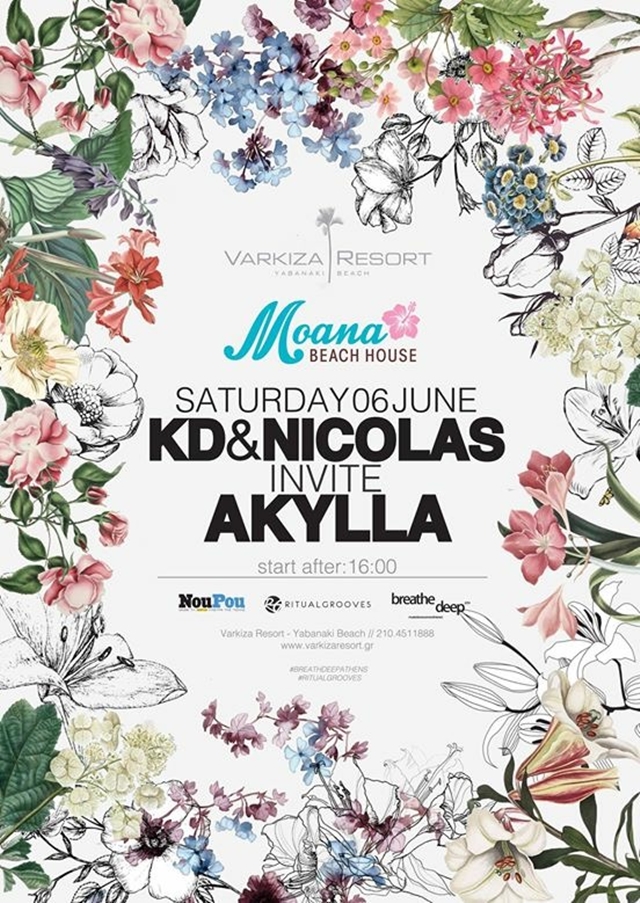 Tο Σάββατο, το αγαπημένο δίδυμο της Ηouse KD & NICOLAS κατεβαίνουν νότια στο #MoanaBeachHouse στη παραλία του #VarkizaResort. Καλεσμένος τους στα decks ο dj AKYLLA, o άνθρωπος που επηρέασε, όσο λίγοι, την Ηouse σκηνή στην Ελλάδα…O resident dj των θρυλικών party Magna και εμπνευστής και resident dj του Breathe Deep-Athens, συνεχίζει να ταξιδεύει το κοινό με deep driving tribal beats και soulful φωνητικά. Παρουσίες καταγράφονται μετά τις 16:00.