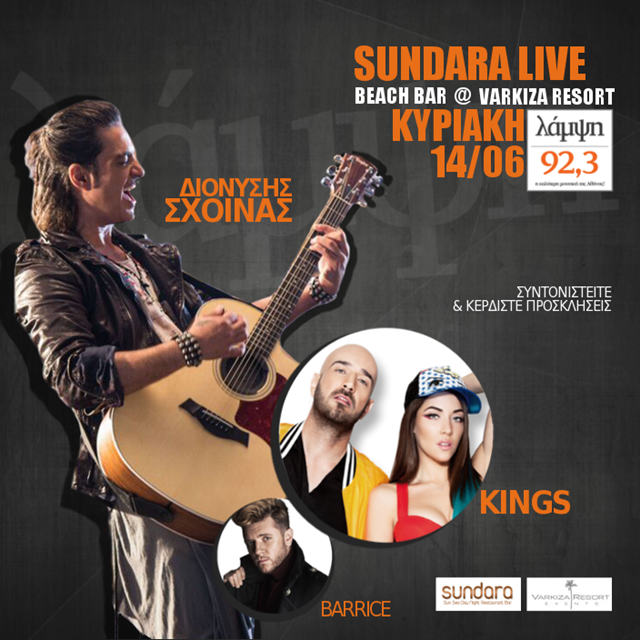 Έπειτα από τις πετυχημένες χειμερινές εμφανίσεις του Διονύση Σχοινά στη μουσική σκηνή του «4711» θα κάνει την εμφάνισή του στην αμμώδη πίστα των νοτίων προαστίων, στο Varkiza Resort. Στο άκρως καλοκαιρινό σκηνικό του exclusive beach bar-restaurant “Sundara” που βρίσκεται πάνω στη θάλασσα, ο αγαπημένος μας καλλιτέχνης θα παρουσιάσει το καινούριο του τραγούδι καθώς και τις γνωστές του επιτυχίες σε μια και μοναδική live εμφάνιση, παρασύροντας μας μαζί του στο μουσικό του ταξίδι! Μαζί του θα είναι οι Kings και ο Barrice. Συντονίσου στον λάμψη 92,3 για να κερδίσεις προσκλήσεις!