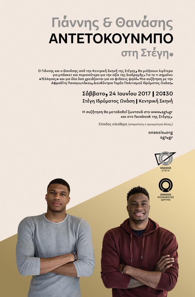 Συντονιστείτε ζωντανά. Σάββατο 24 Ιουνίου 2017, στις 20:30. Live στο facebook και στο site της Στέγης. Ο Γιάννης και ο Θανάσης Αντετοκούνμπο από την Κεντρική Σκηνή της Στέγης θα μιλήσουν λιγότερο για μπάσκετ, και περισσότερο για την αξία της διαδρομής, για το τι σημαίνει «Έλληνας» και για όλα όσα χρειάζονται για να φτάσεις ψηλά. Η συζήτηση θα πραγματοποιηθεί με την Αφροδίτη Παναγιωτάκου, Διευθύντρια Τομέα Πολιτισμού Ιδρύματος Ωνάση.