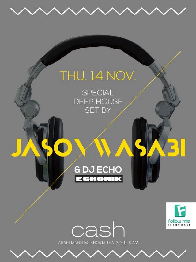 Ο Jason Wasabi πάει Κηφισιά και συγκεκριμένα στο Cash, όπου απόψε (Πέμπτη 14 Νοεμβρίου) θα στηθεί ένα deep house πάρτι στο βόρειο "σπίτι" του Γιάννη Μωράκη.