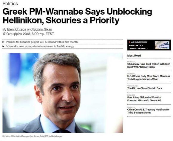 Σε συνέντευξη του στο πρακτορείο Bloomberg ο Κ. Μητσοτάκης δεσμεύτηκε να ξεκινήσει η επένδυση στο Ελληνικό μέσα στο 2019.