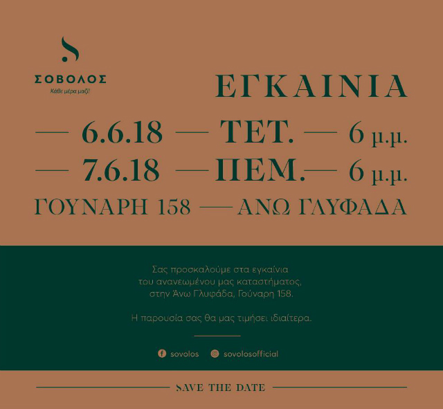Τα εγκαίνια του νέου και ανακαινισμένου “Σόβολος” στην οδό Γούναρη 158 στην Άνω Γλυφάδα θα πραγματοποιηθούν την Τετάρτη 6/6 και την Πέμπτη 7/6, στις 18.00.