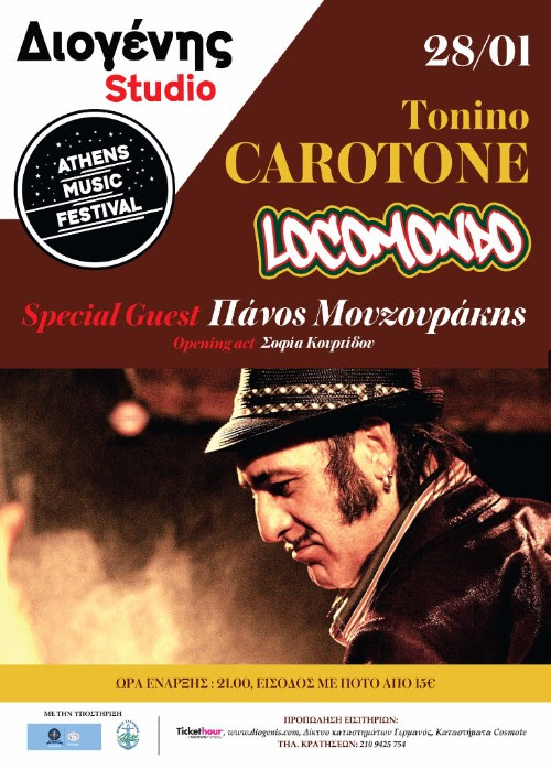 Μία ανατρεπτική βραδιά ετοιμάζεται απόψε στο πλαίσιο του Athens Music Festival. Ο εκκεντρικός Βάσκος καλλιτέχνης Tonino Carotone συναντά τους Locomondo και τον μοναδικό Πάνο Μουζουράκη. Opening act της βραδιάς, είναι η Σοφία Κουρτίδου.