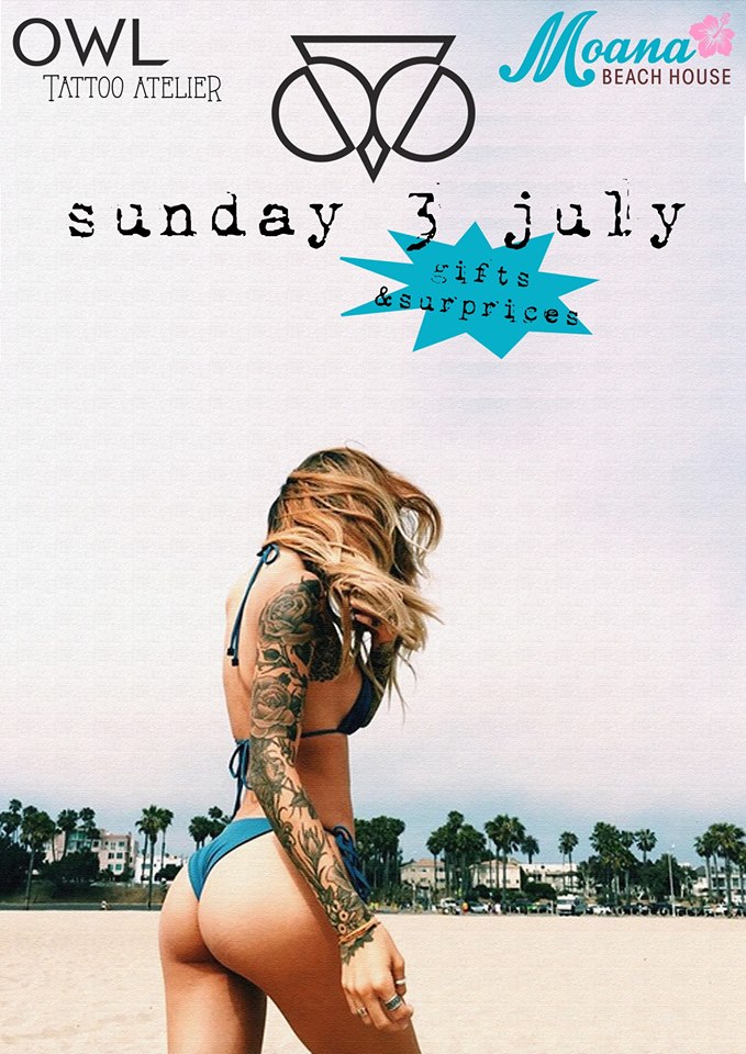 Tην Κυριακή το Owl Tattoo Atelier της Γλυφάδας (Γρ. Λαμπράκη 23 -212 1049848) κάνει παρτάκι στην παραλία της Βάρκιζας στο Moana Beach Bar / Yabanaki.