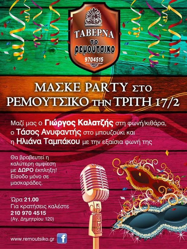 Το μασκέ πάρτι στο Ρεμούτσικο (γνωστό και ξακουστό ως το μαγαζί που φτιάχνει τα καλύτερα παϊδάκια (αλλά και κοντοσούβλι)) θα διεξαχθεί την Τρίτη 17 Φεβρουαρίου και θα έχει χορό και τραγούδι. Ο Γιώργος Καλατζής θα είναι στη φωνή και στην κιθάρα, ο Τάσος Ανυφαντής στο μπουζούκι κι η Ηλιάνα Τσαμπάκου θα βάλει την εξαίσια φωνή της.