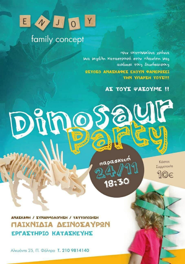 Στο Enjoy Family Concept, θα γίνει το πιο διασκεδαστικό πάρτυ δεινοσαύρων, με εργαστήριο κατασκευής και παιχνίδια δεινοσαύρων.