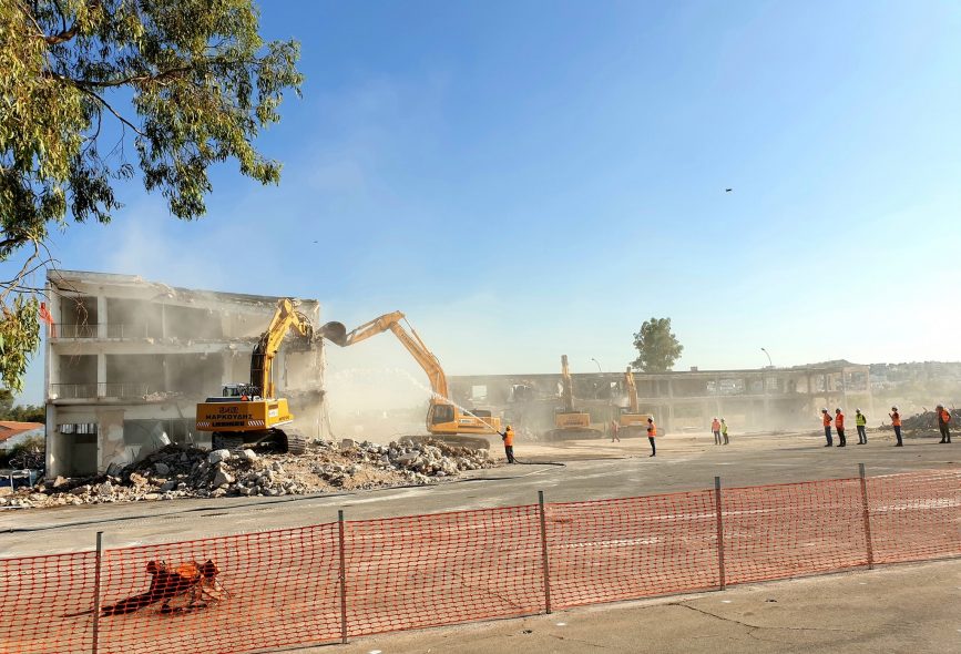Αμέσως μετά την ομιλία του πρωθυπουργού οι μπουλντόζες έπιασαν δουλειά και ξεκίνησαν την κατεδάφιση ενός παλαιού κτιρίου. Υπενθυμίζεται πως από την Τετάρτη είχαν ξεκινήσει οι πρώτες εργασίες, καθώς μπουλντόζες μπήκαν στο Ελληνικό αρχίζοντας την κατεδάφιση των κτιρίων.