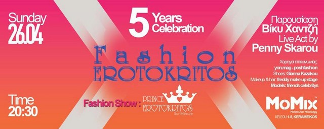 To Fashion Erotokritos γιορτάζει τα 5α γενέθλια του με ένα μεγάλο fashion party και μας προκαλεί να διασκεδάσουμε μαζί. Πότε; Την Κυριακή 26 Απριλίου. Που; Στο Momix στον Κεραμεικό.